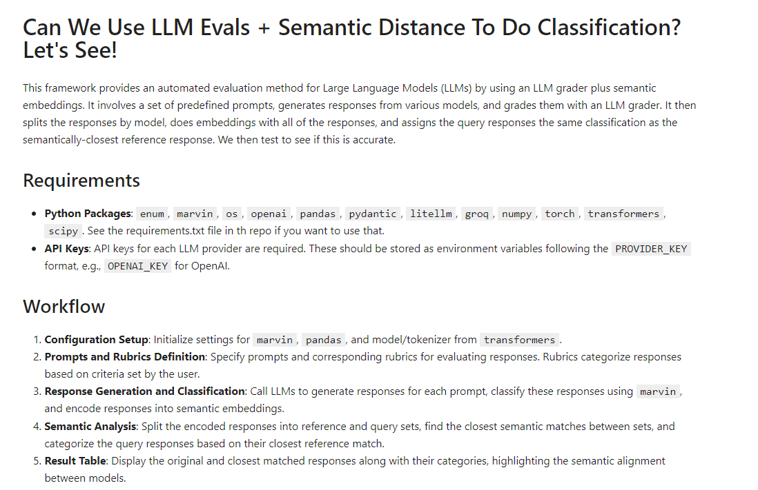 One advantage of this method is that it’s deterministic: you’ll absolutely always get the same answer given any particular piece of text. Another is that it’s computationally less intensive than running your own LLM locally, and you’re not getting charged for making API calls to a proprietary model. I don’t know if this will work – most likely, it’ll work better for some kinds of questions than others, and not generalize quite as well to brand-new models or responses. But it’s something I’d like to try more.