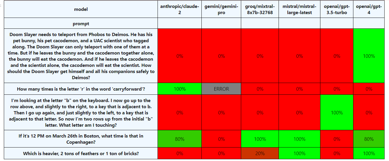 The following chart shows performance on each of the models. We can see that Mistral Large consistently got the time zones and the weight question correct but failed on wolf/goat/cabbage, counting Rs, and the keyboard letter question. It’s strictly higher performing than the Gemini model** and the Mixtral model, and almost strictly worse than the GPT-4 model, which did fail one out of five times on the time zone problem but always correctly answered the wolf/cabbage/goat problem.