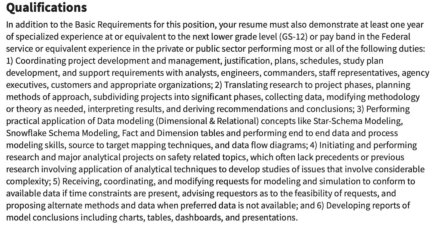 If you’re new to federal hiring, you might be surprised by how structured the resume review process is. Reviewers — whether in HR or the actual office doing the hiring— compare your resume against a specific set of requirements. They typically score each one in a spreadsheet and have limited discretion. They can’t check your GitHub profile or make assumptions based on your job titles.