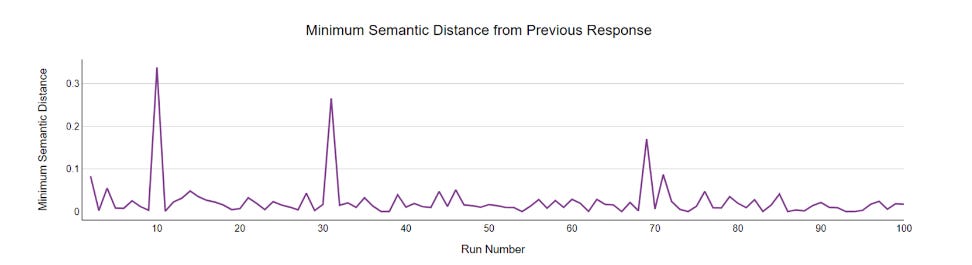 Below is an example of what that looks like. You can still see occasional spikes at the beginning, representing extremely semantically novel responses, but then as we keep going, we see these less frequently and they’re less spiky, meaning they’re less novel.
