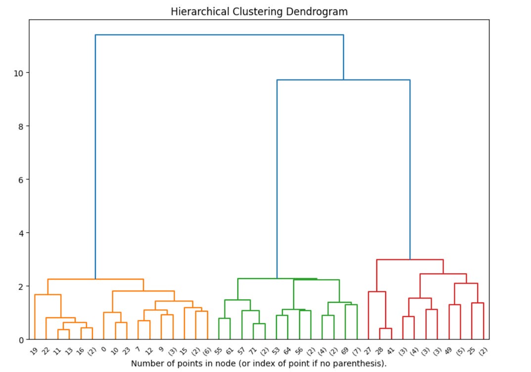 So instead, I use a hierarchical clustering method that minimizes the variance within each cluster while also performing multiple levels of clustering. This clustering is another type of dimensionality reduction: we’re going from 768-dimensional space to n-dimensional space, where n is the number of clusters.
