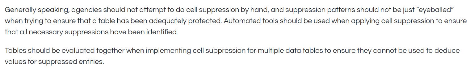 This would also be consistent with National Center for Education Statistics (NCES) guidance on the topic of cell suppression, which includes the following: “Automated tools should be used when applying cell suppression to ensure that all necessary suppressions have been identified.”