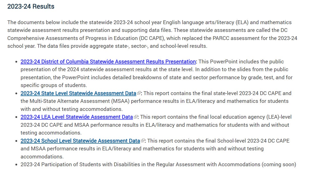 DC satisfies its nationally mandated standardized testing requirements via a test given to 3rd through 10th graders. It used to be called the PARCC (Partnership for Assessment of Readiness for College and Careers). There’s no more partnership – the other states using it dropped out – so now it’s the DC CAPE, for the District of Columbia Comprehensive Assessments of Progress in Education.