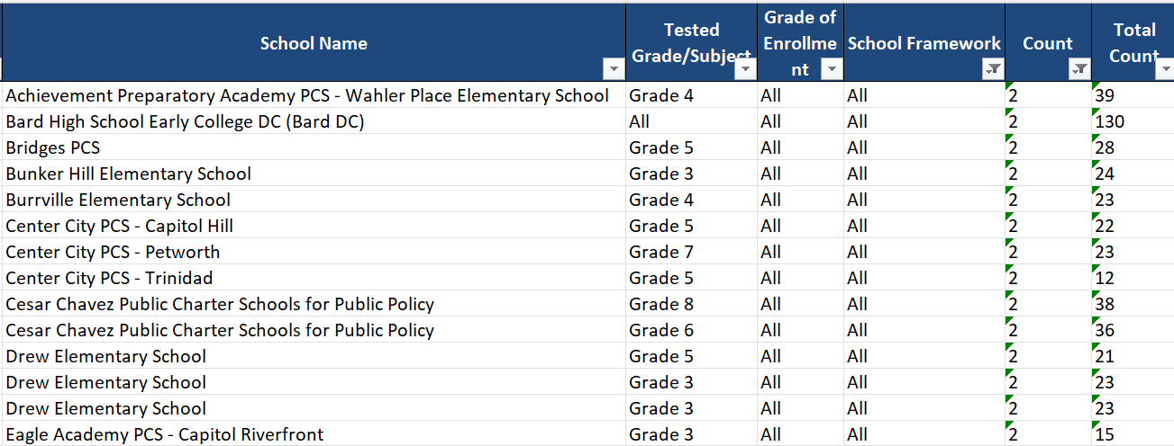 But, while a huge amount of DC CAPE data is released, some of the data is suppressed. The justification here is that they don’t want data to be identifiable – for someone to be able to figure out something about specific kids based on the data. Suppression is done in two ways. First, when the group in question is very small: this is primary suppression. But there’s also secondary suppression – when a subgroup isn’t itself very small, but revealing it would allow users to infer one of the numbers that’s undergone primary suppression. For instance, if one grade level’s data is suppressed due to size, another would need to be suppressed as well, or else it would be possible to infer the suppressed data via subtracting the remaining grades from the school-wide totals.