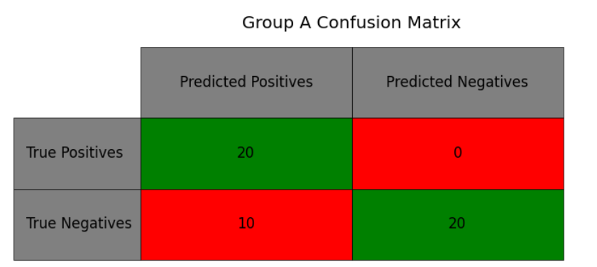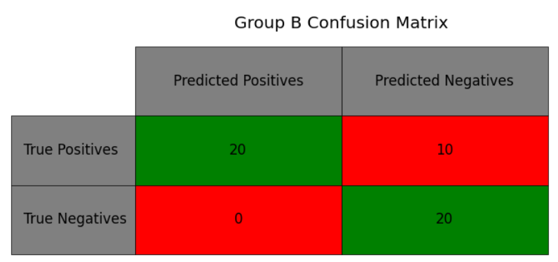 And we see the issue inverted with Group B. Here, whenever the model passes someone, it’s always correct — but it’s not letting a lot of people through who it should.
