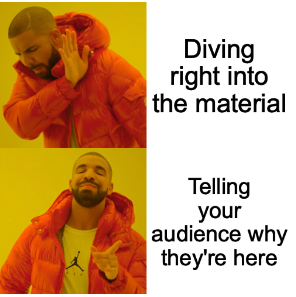 But I’m not confident it would work for me, so I tell my audience why they're here in the first five minutes of any talk. And for talks over Zoom (where my audience will likely give me even less of a grace period before they tune me out and start answering their emails) I do it even sooner.