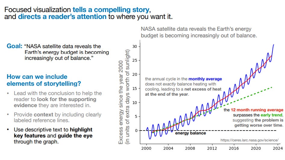 The slide below, from NASA Senior Graphics Designer & Data Visualization Specialist Alex Gurvich, provides an example of how to direct attention on a graph to the elements that you want your audience to notice.